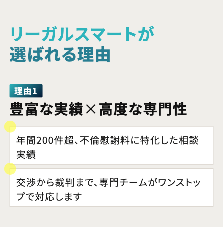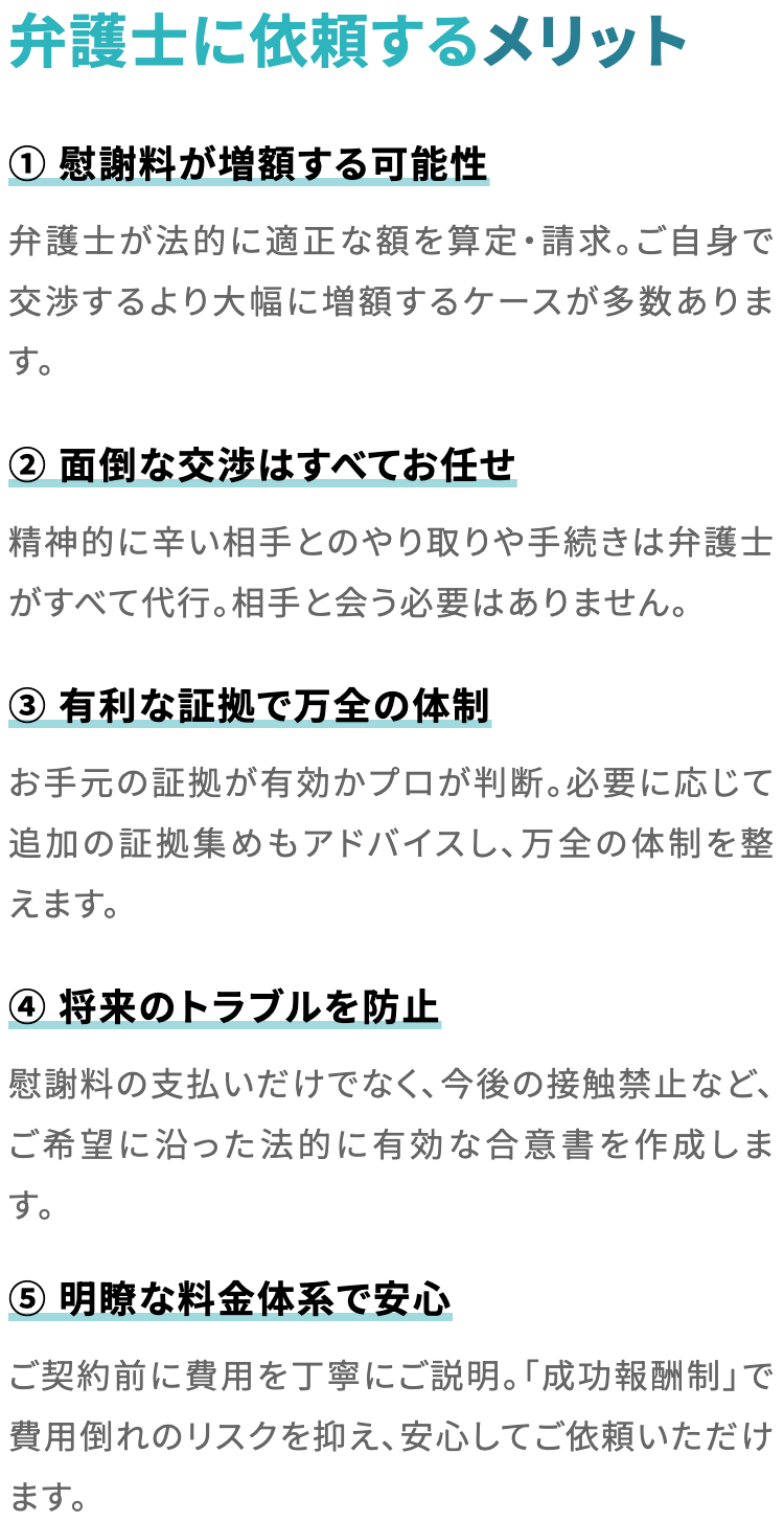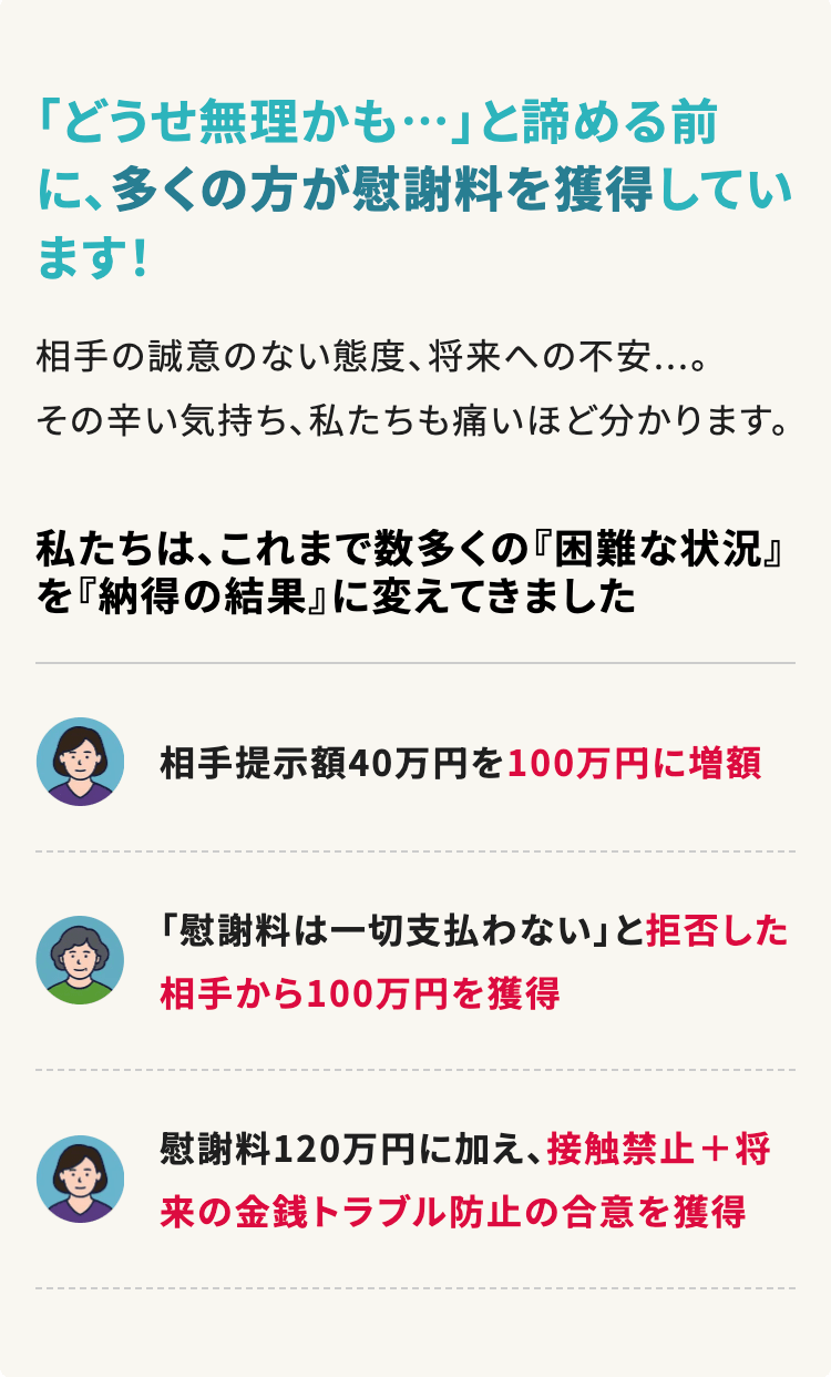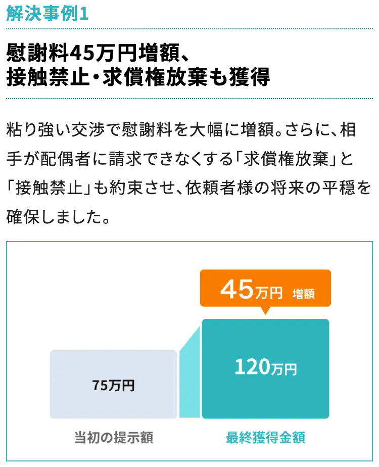 【不倫慰謝料専門チームが対応】不倫慰謝料の実績豊富|専門性の高い弁護士が対応いたします。不倫が発覚し、不倫相手に慰謝料を請求したい方、まずはご相談下さい◆初回面談0円◆オンライン面談も可能◆※詳細ページで即面談予約ができます