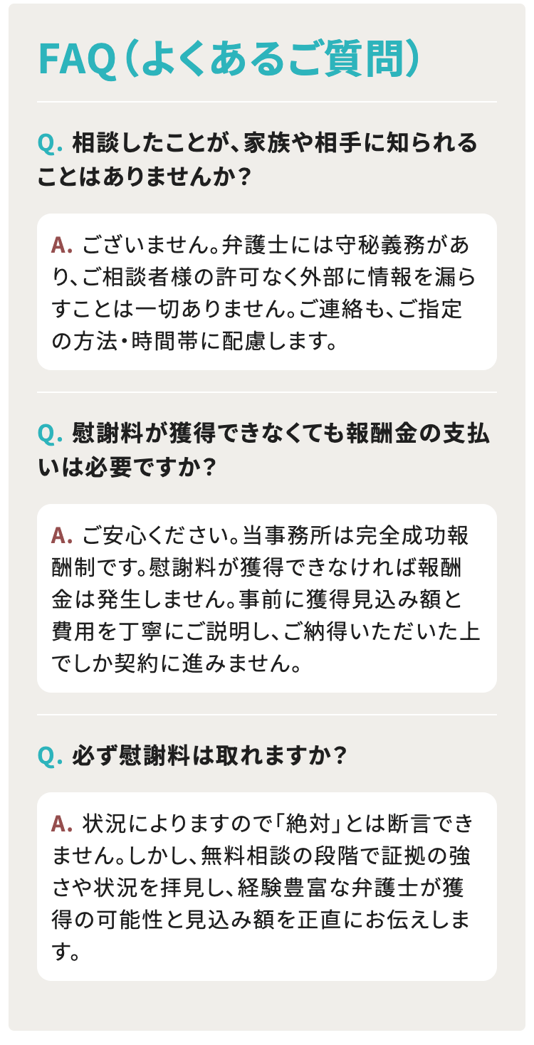 【何度でも相談無料/成功報酬金は後払い周りに知られずに相談OK】浮気・不倫の慰謝料請求(慰謝料減額)で後悔しないために。慰謝料問題に詳しい弁護士が、あなたにとってのベストな解決策をご提案します!